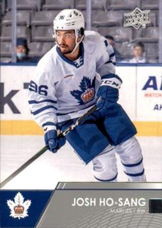 The Josh Ho Sang 2021 Upper Deck AHL #38 Base card is 1 of 9 Josh Ho Sang's card variations in the 2021 Upper Deck AHL set being tracked by Sports Card Investor, including Exclusives /100, High Gloss /10, Autographs, Blue, and Printing Plates - Black /1.