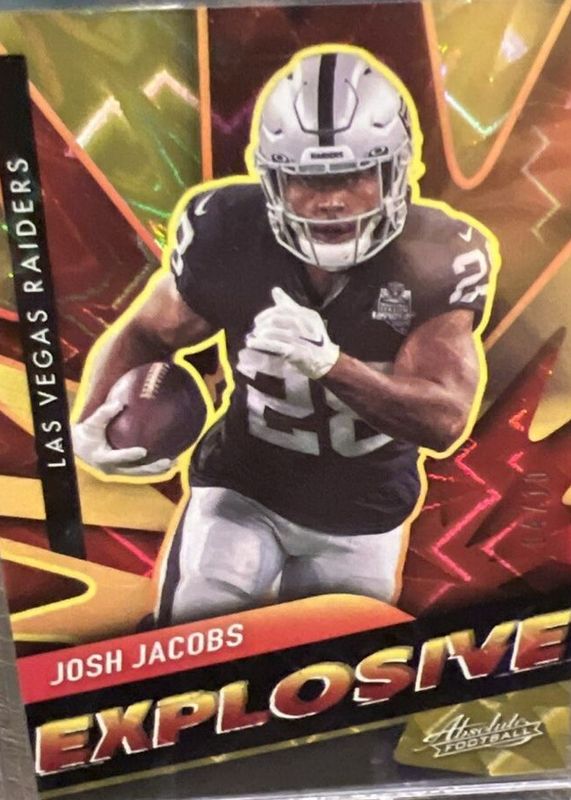 The Josh Jacobs 2021 Absolute #E24 Explosive - Gold /10 card in Raw condition has not changed in price in the last 30 days and was last sold for $247.50 .