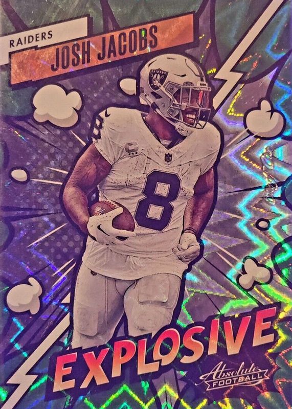 This card is 1 of 9 Josh Jacobs' card variations in the 2023 Absolute set being tracked by Sports Card Investor, including Kaboom! (Horizontal), Kaboom! (Vertical), Explosive /(SSP), Explosive - Gold /10, and Kaboom! (Horizontal) - Gold /10.
