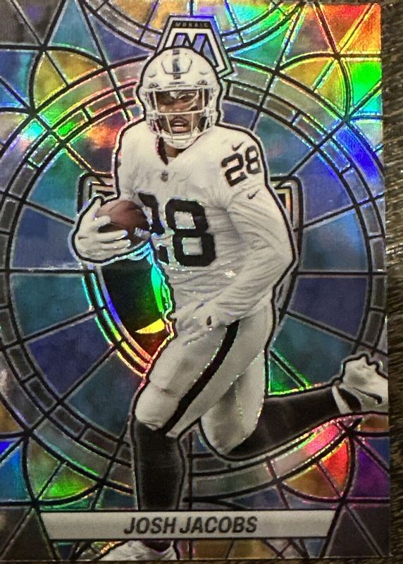 The Josh Jacobs 2023 Mosaic #SG-12 Stained Glass /(SSP) card in Raw condition has moved up $7.00 (+11.7%) in the last 30 days and was last sold for $67.00 .