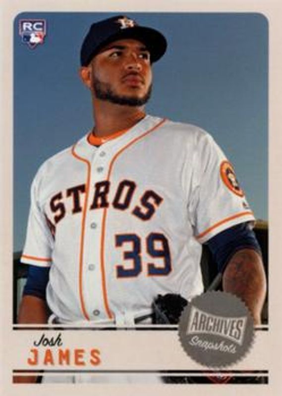 The Josh James 2019 Topps Archives Snapshots #AS-JJ Base Rookie card is 1 of 9 Josh James' card variations in the 2019 Topps Archives Snapshots set being tracked by Sports Card Investor, including Black & White, Blue /50, Gold /10, Black /1, and Autographs.