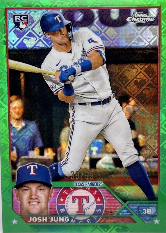 The Josh Jung 2023 Topps Chrome Logofractor Edition #93 Green /99 Rookie card in Raw condition has not changed in price in the last 30 days and was last sold for $2.25 .