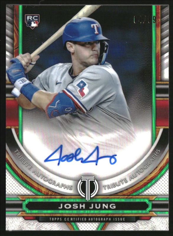 The Josh Jung 2023 Topps Tribute #TA-JJ Autographs - Green /99 Rookie card is 1 of 16 Josh Jung's card variations in the 2023 Topps Tribute set being tracked by Sports Card Investor, including Autographs /199, Autographs - Blue /150, League Inauguration Autographs /99, Autographs - Gold /75, and Autographs - Purple /50.