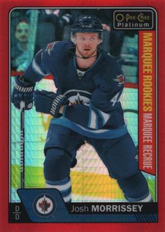 The Josh Morrissey 2016 O-Pee-Chee Platinum #172 Red Prism /199 Rookie card is 1 of 28 Josh Morrissey's card variations in the 2016 O-Pee-Chee Platinum set being tracked by Sports Card Investor, including Base, Ice Blue Traxx, Rainbow, Rainbow Color Wheel, and Royal Blue Cubes /99.