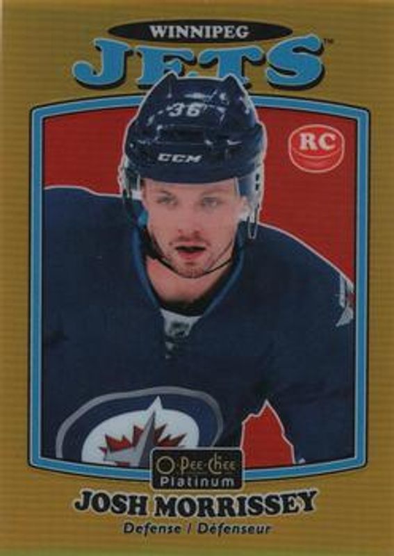 The Josh Morrissey 2016 O-Pee-Chee Platinum #R-89 Retro Gold Rainbow /149 Rookie card is 1 of 28 Josh Morrissey's card variations in the 2016 O-Pee-Chee Platinum set being tracked by Sports Card Investor, including Base, Ice Blue Traxx, Rainbow, Rainbow Color Wheel, and Red Prism /199.