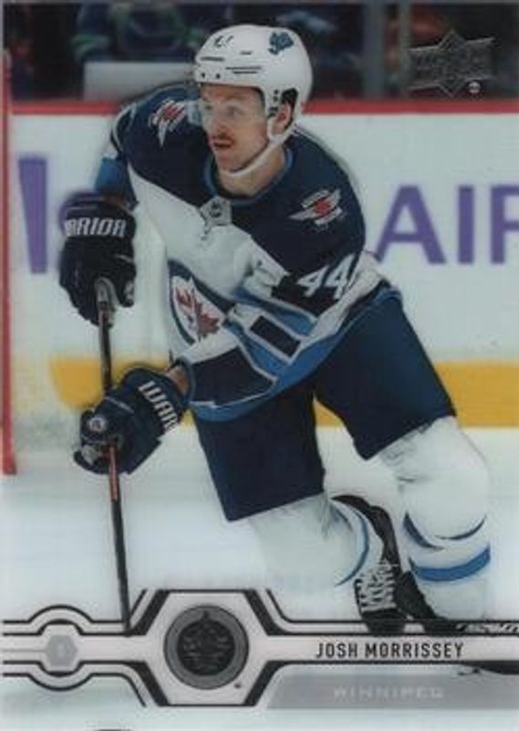The Josh Morrissey 2019 Upper Deck #108 Clear Cut card is 1 of 12 Josh Morrissey's card variations in the 2019 Upper Deck set being tracked by Sports Card Investor, including Base, UD Exclusives Clear Cut, UD Exclusives /100, UD High Gloss /10, and Silver Foil.
