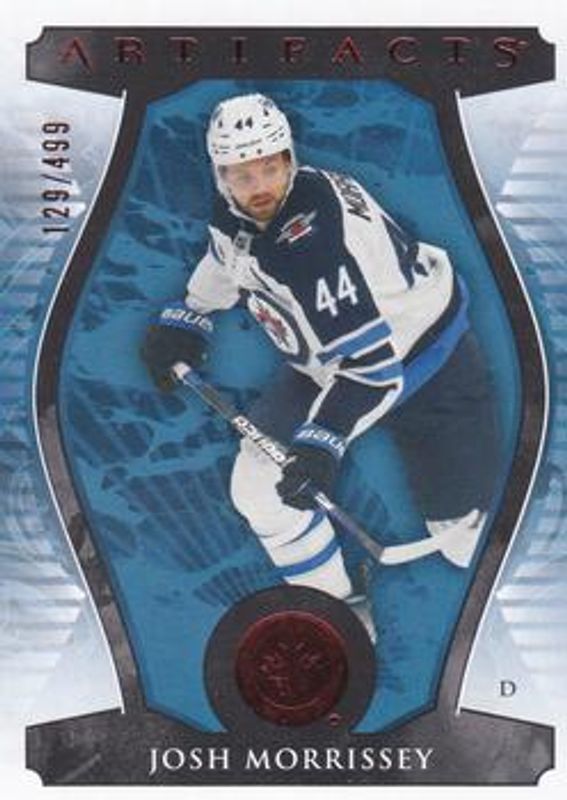 The Josh Morrissey 2023 Upper Deck Artifacts #58 Ruby /499 card is 1 of 19 Josh Morrissey's card variations in the 2023 Upper Deck Artifacts set being tracked by Sports Card Investor, including Base /999, Turquoise, Copper /299, Royal Blue /199, and Emerald /99.