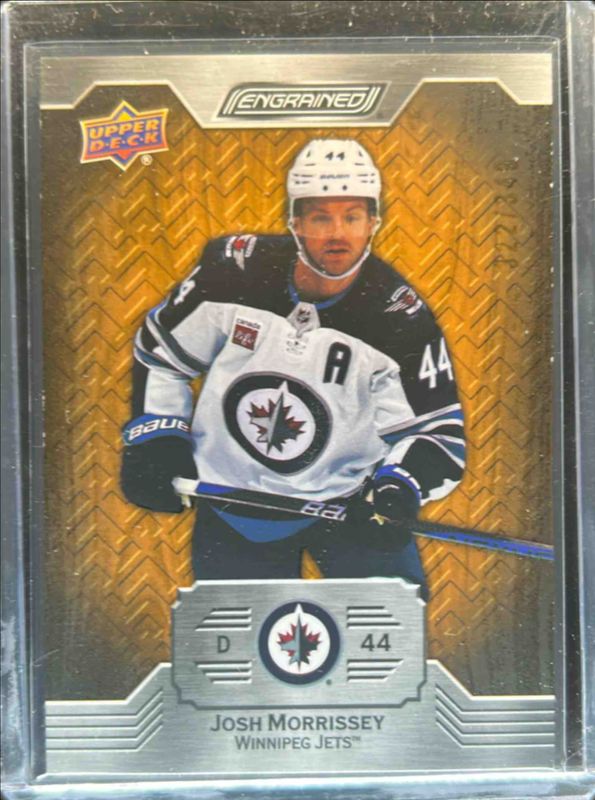 The Josh Morrissey 2023 Upper Deck Engrained #14 Oak /399 card is 1 of 11 Josh Morrissey's card variations in the 2023 Upper Deck Engrained set being tracked by Sports Card Investor, including Autographs White Birch /50, Ebony /49, Memorabilia Auto Mahogany /25, White Birch /20, and Memorabilia Ebony /15.