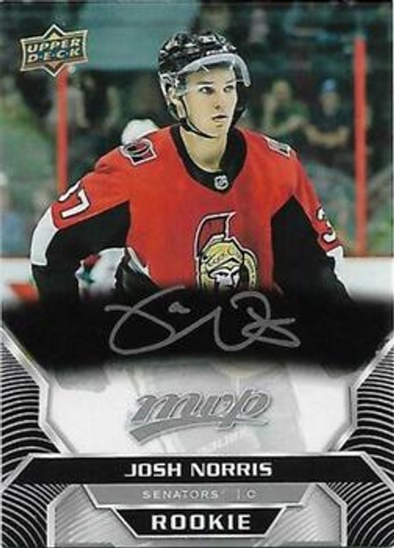 The Josh Norris 2020 Upper Deck MVP #234 Silver Script Rookie card is 1 of 18 Josh Norris' card variations in the 2020 Upper Deck MVP set being tracked by Sports Card Investor, including Base, Blue, Gold Script, Super Script /25, and Super Script Black /5.