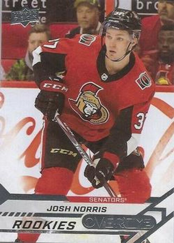 The Josh Norris 2020 Upper Deck Overtime #49b Base Rookie card is 1 of 9 Josh Norris' card variations in the 2020 Upper Deck Overtime set being tracked by Sports Card Investor, including Base, Blue Foil, Gold Foil Autographs, Red Foil /99, and Next in Line.