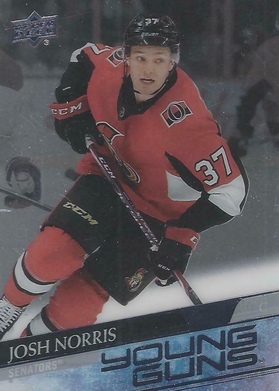 This card is 1 of 10 Josh Norris' card variations in the 2020 Upper Deck set being tracked by Sports Card Investor, including Young Guns Base, Young Guns Canvas, Young Guns - Clear Cut Exclusives, Young Guns - French, and Young Guns - Jumbo.