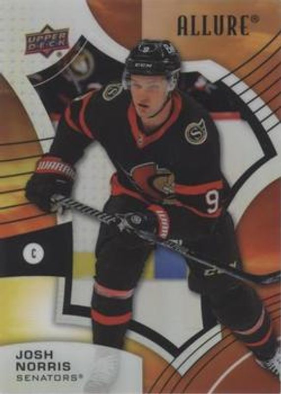 The Josh Norris 2021 Upper Deck Allure #16 Sunrise card is 1 of 36 Josh Norris' card variations in the 2021 Upper Deck Allure set being tracked by Sports Card Investor, including Base, Black Rainbow, Blue China, Orange Slice die-cut, and Pink Blue Leopard.