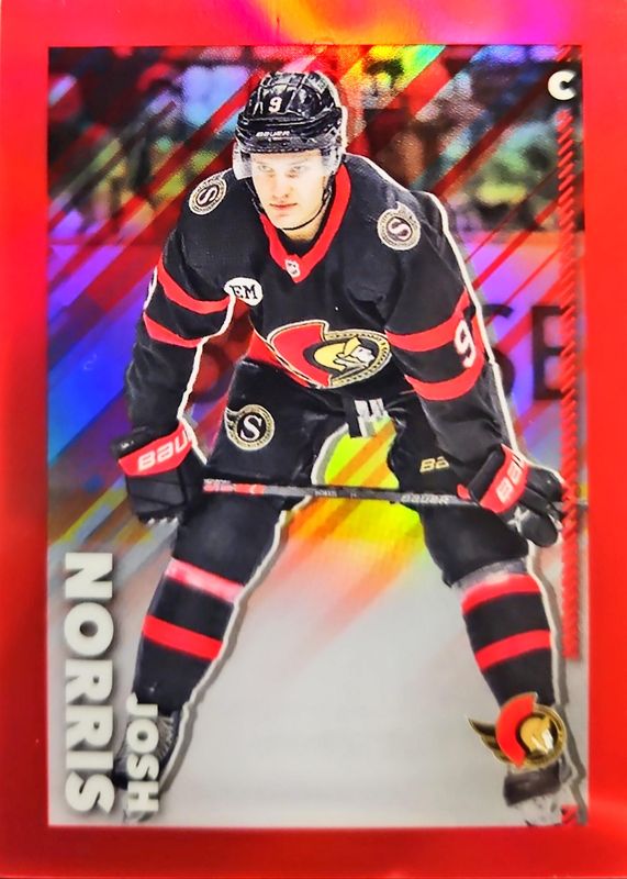 The Josh Norris 2022 Topps Chrome NHL Sticker Collection #354 Red Refractor /5 card in Raw condition has not changed in price in the last 30 days and was last sold for $12.99 .