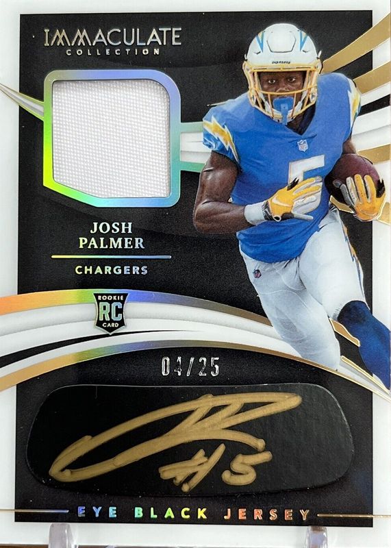 The Josh Palmer 2021 Immaculate #REB-JP Immaculate Rookie Eye Black Jersey Autographs - Gold (/25) card in Raw condition has not changed in price in the last 30 days and was last sold for $40.00 .