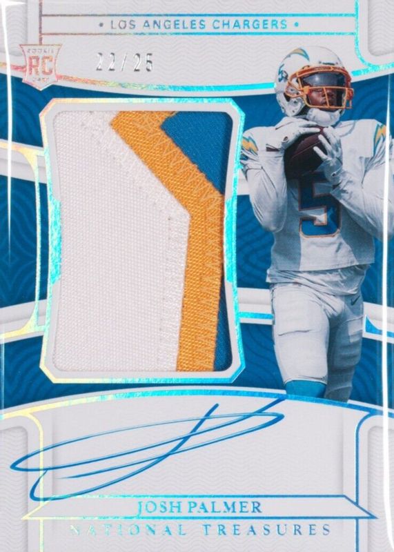 This card is 1 of 36 Josh Palmer's card variations in the 2021 National Treasures set being tracked by Sports Card Investor, including Rookie Patch Auto /99, Rookie Patch Auto - Green Jersey Number (/5), Rookie Patch Auto - Purple /49, Rookie Patch Auto - Stars & Stripes Holo Silver /25, and Rookie Patch Auto - Midnight /20.