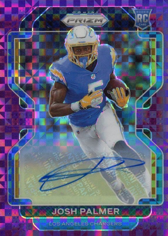 This card is 1 of 18 Josh Palmer's card variations in the 2021 Prizm set being tracked by Sports Card Investor, including Silver, Rookie Autographs - No Huddle, Rookie Autographs - Pink, Rookie Autographs - Purple Pulsar, and Rookie Autographs - Silver.