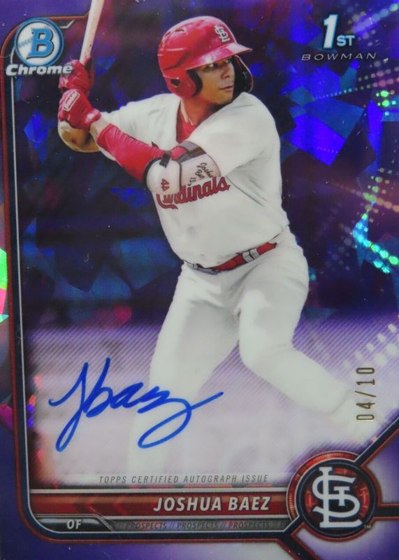 The Joshua Baez 2022 Bowman Sapphire Edition #BSPA-JB Chrome Prospect Auto - Purple /10 (1st) card in Raw condition has not changed in price in the last 30 days and was last sold for $255.00 .