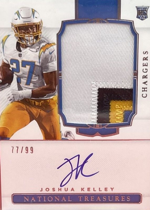 The Joshua Kelley 2020 National Treasures #195 Rookie Patch Auto /99 card in Raw condition has not changed in price in the last 30 days and was last sold for $5.51 .