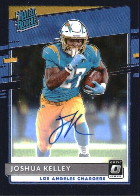 This card is 1 of 12 Joshua Kelley's card variations in the 2020 Optic set being tracked by Sports Card Investor, including Rated Rookie Autographs - Bronze, Rated Rookie Autographs - Red Hyper, Rated Rookie Autographs /150, Rated Rookie Autographs - Holo /99, and Rated Rookie Autographs - Blue /75.