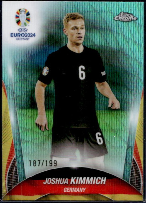 The Joshua Kimmich 2023 Topps Chrome UEFA Euro #40 Aqua Wave Refractor /199 card is 1 of 17 Joshua Kimmich's card variations in the 2023 Topps Chrome UEFA Euro set being tracked by Sports Card Investor, including Base, Green Ray Wave Refractor, Refractor, Purple Lava Refractor /175, and Neon Green Refractor /150.
