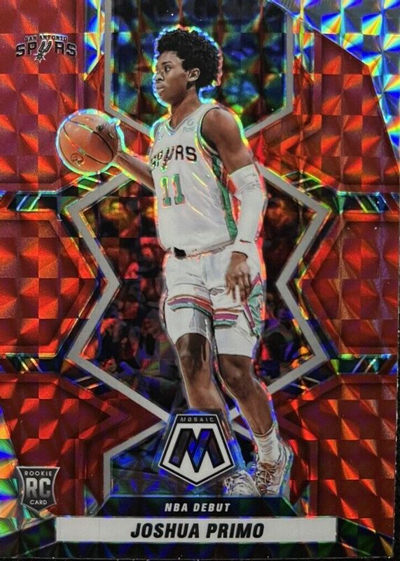 The Joshua Primo 2021 Mosaic #275 NBA Debut - Red Rookie card in Raw condition has not changed in price in the last 30 days and was last sold for $1.00 .