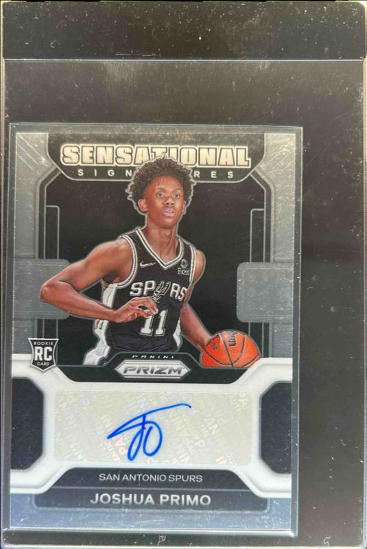 The Joshua Primo 2021 Prizm #SS-JPR Sensational Signatures Rookie card is 1 of 102 Joshua Primo's card variations in the 2021 Prizm set being tracked by Sports Card Investor, including #298b Base, #298 Base, #298 Photo Variation, #298 Blue NBA 75th Anniversary, and #298 Blue Wave.