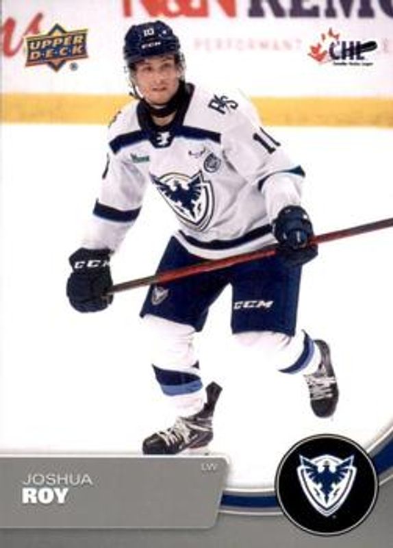 The Joshua Roy 2021 Upper Deck CHL #12 Base card is 1 of 15 Joshua Roy's card variations in the 2021 Upper Deck CHL set being tracked by Sports Card Investor, including Autographs, Exclusives /100, High Gloss /10, Printing Plates Black /1, and Printing Plates Cyan /1.