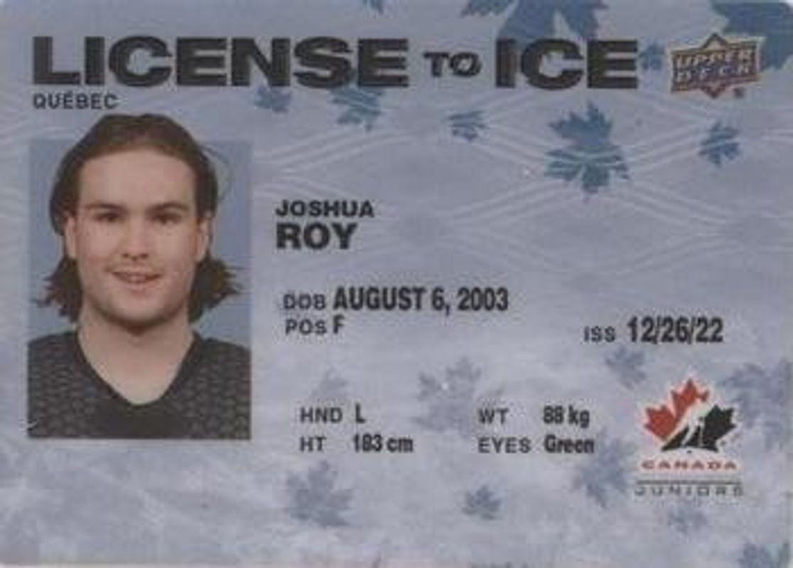 The Joshua Roy 2023 Upper Deck Team Canada Juniors #LI-27 License to Ice card is 1 of 67 Joshua Roy's card variations in the 2023 Upper Deck Team Canada Juniors set being tracked by Sports Card Investor, including #127 Base, #5 Base, #80 Base, #127 Clear Cut, and #80 Clear Cut.