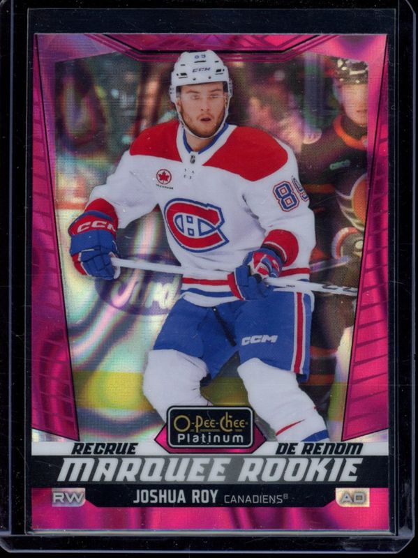 The Joshua Roy 2024 O-Pee-Chee Platinum #208 Pink Magma Rookie card is 1 of 15 Joshua Roy's card variations in the 2024 O-Pee-Chee Platinum set being tracked by Sports Card Investor, including Base, Neon Yellow Surge, Rainbow, Sunset, and Violet Pixels /299.