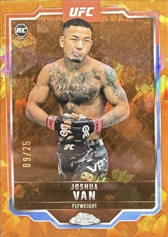 The Joshua Van 2025 Topps Chrome UFC Sapphire Edition #136 Orange /25 Rookie card is 1 of 14 Joshua Van's card variations in the 2025 Topps Chrome UFC Sapphire Edition set being tracked by Sports Card Investor, including Base, Green /75, Gold /50, Purple /10, and Red /5.