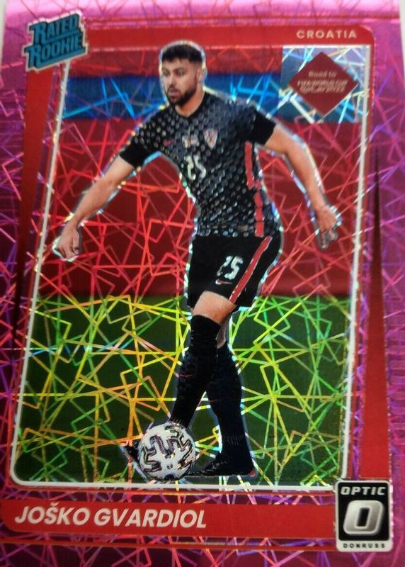The Josko Gvardiol 2021 Donruss #185 Optic - Pink Velocity /25 Rookie card in Raw condition has not changed in price in the last 30 days and was last sold for $69.99 .