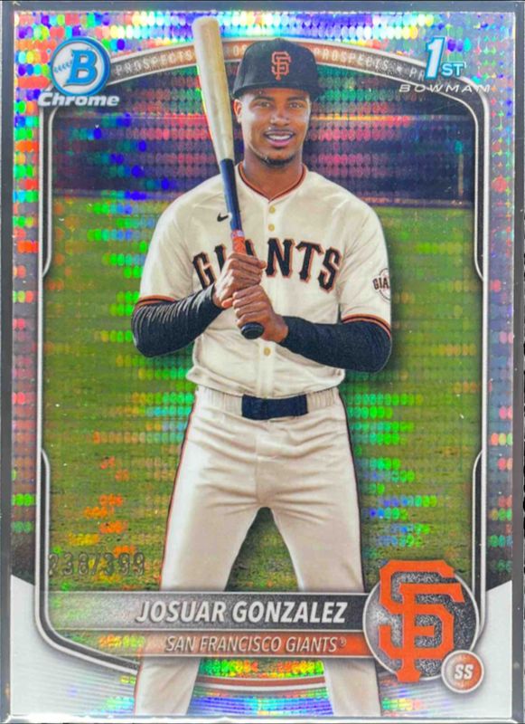 The Josuar Gonzalez 2025 Bowman Chrome #BCP-153 Prospects - Gold Wave Refractor /50 (1st) card in Raw condition has not changed in price in the last 30 days and was last sold for $66.00 .