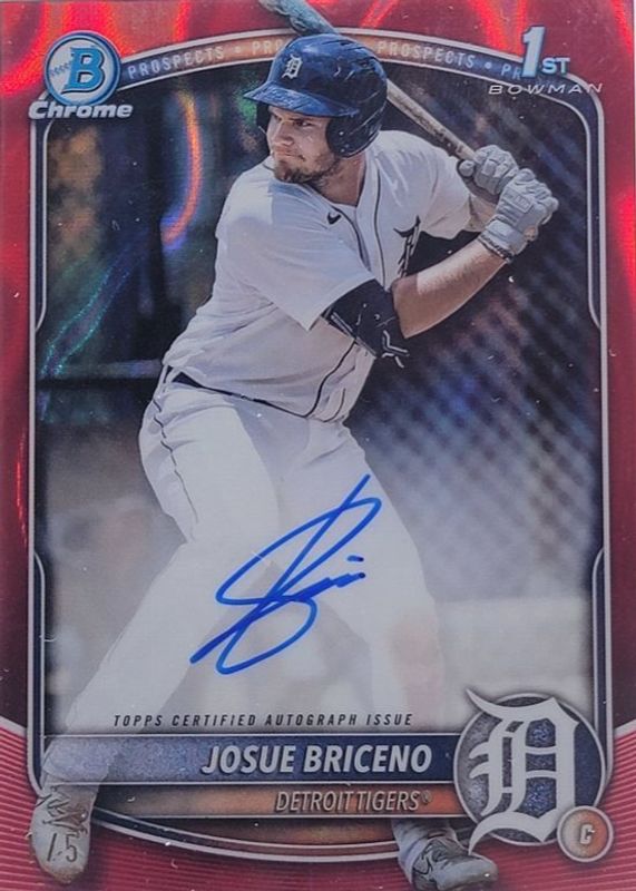 The Josue Briceno 2025 Bowman #CPA-JB Chrome Prospect Auto - Red Lava Refractor /5 (1st) card in Raw condition has not changed in price in the last 30 days and was last sold for $825.00 .