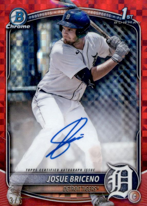 The Josue Briceno 2025 Bowman #CPA-JB Chrome Prospect Auto - Red X-Fractor /5 (1st) card in Raw condition has not changed in price in the last 30 days and was last sold for $1,202.00 .
