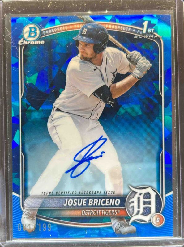 The Josue Briceno 2025 Bowman Sapphire Edition #CPS-JB Chrome Prospect Autographs /199 card is 1 of 16 Josue Briceno's card variations in the 2025 Bowman Sapphire Edition set being tracked by Sports Card Investor, including Chrome Prospects, Chrome Prospect Autographs - Green Refractor /99, Chrome Prospects - Green Refractor /99, Chrome Prospects - Yellow Refractor /75, and Chrome Prospect Autographs - Gold Refractor /50.