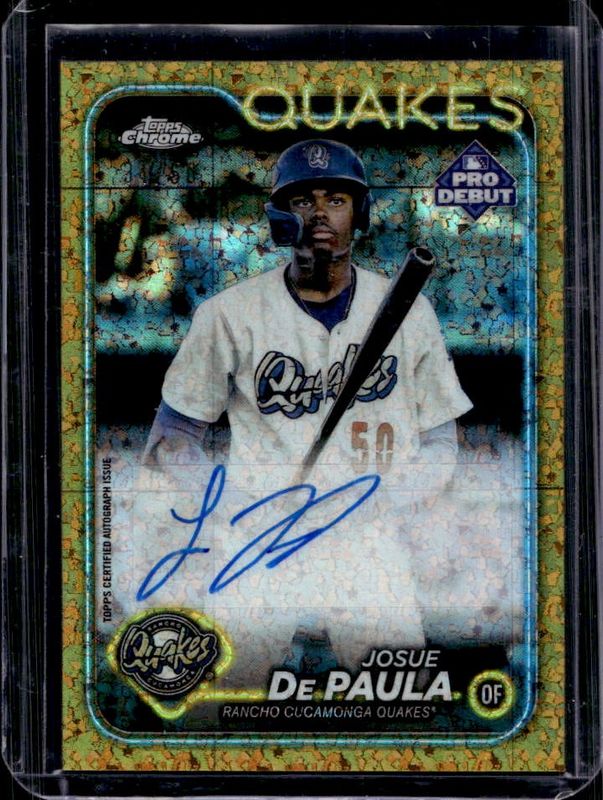 The Josue De Paula 2024 Topps Pro Debut #PDC-119 Chrome Autographs - Gold Mini-Diamond Refractor /50 card is 1 of 37 Josue De Paula's card variations in the 2024 Topps Pro Debut set being tracked by Sports Card Investor, including Base, Fuchsia Foil /199, Sparkle Foil /175, Blue Foil /150, and Green Foil /99.