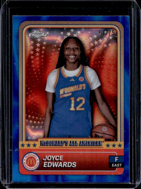 The Joyce Edwards 2024 Topps Chrome McDonald's All-American #53 Blue Lava Refractor /75 card is 1 of 112 Joyce Edwards' card variations in the 2024 Topps Chrome McDonald's All-American set being tracked by Sports Card Investor, including #53 Base, #3 Base, #3 Blue RayWave Refractor, #53 Blue RayWave Refractor, and #3 McDonald's Logo Refractor.