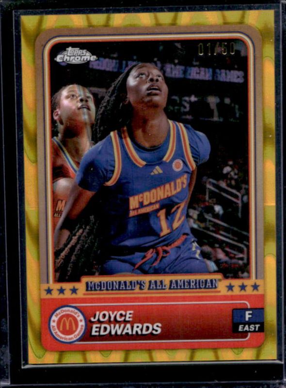 The Joyce Edwards 2024 Topps Chrome McDonald's All-American #3 Gold RayWave Refractor /50 card is 1 of 112 Joyce Edwards' card variations in the 2024 Topps Chrome McDonald's All-American set being tracked by Sports Card Investor, including #53 Base, #3 Base, #3 Blue RayWave Refractor, #53 Blue RayWave Refractor, and #3 McDonald's Logo Refractor.