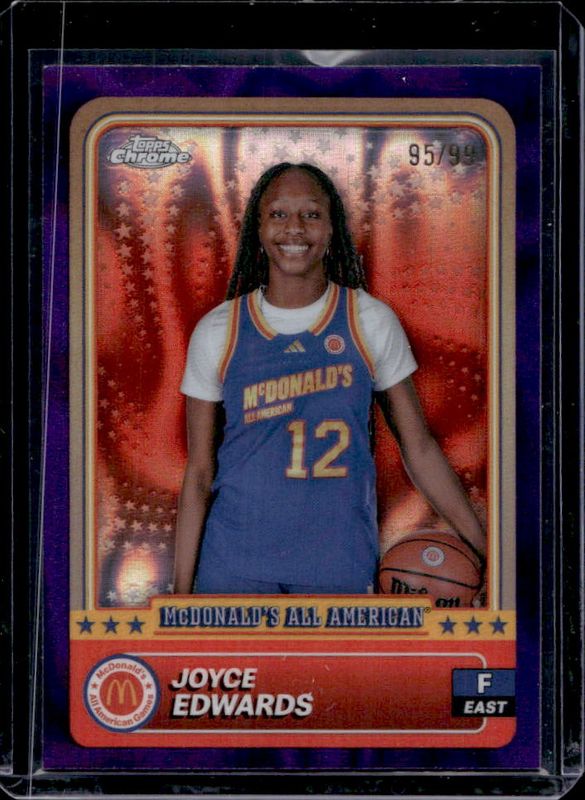The Joyce Edwards 2024 Topps Chrome McDonald's All-American #53 Purple Lava Refractor /99 card is 1 of 112 Joyce Edwards' card variations in the 2024 Topps Chrome McDonald's All-American set being tracked by Sports Card Investor, including #53 Base, #3 Base, #3 Blue RayWave Refractor, #53 Blue RayWave Refractor, and #3 McDonald's Logo Refractor.