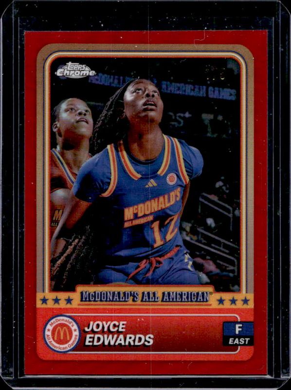 The Joyce Edwards 2024 Topps Chrome McDonald's All-American #3 Red Refractor /5 card is 1 of 112 Joyce Edwards' card variations in the 2024 Topps Chrome McDonald's All-American set being tracked by Sports Card Investor, including #53 Base, #3 Base, #3 Blue RayWave Refractor, #53 Blue RayWave Refractor, and #3 McDonald's Logo Refractor.