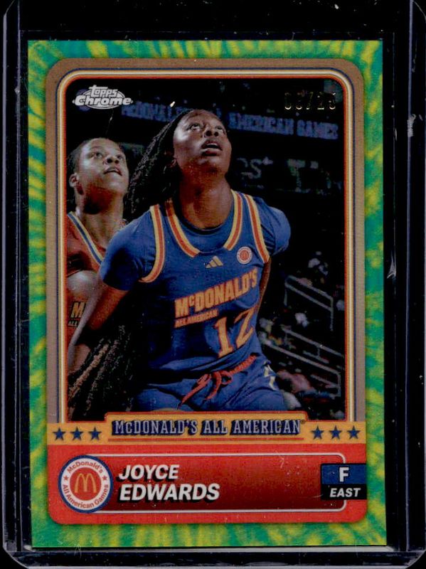 The Joyce Edwards 2024 Topps Chrome McDonald's All-American #3 Tie-Dye Refractor /25 card is 1 of 112 Joyce Edwards' card variations in the 2024 Topps Chrome McDonald's All-American set being tracked by Sports Card Investor, including #53 Base, #3 Base, #3 Blue RayWave Refractor, #53 Blue RayWave Refractor, and #3 McDonald's Logo Refractor.