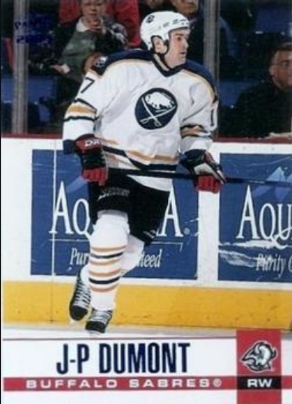 The JP Dumont 2003 Pacific #40 Blue /250 card is 1 of 5 JP Dumont's card variations in the 2003 Pacific set being tracked by Sports Card Investor, including Jerseys, Jerseys Gold /50, L'Internationale des Collectionneurs Montreal /1, and National Convention /1.