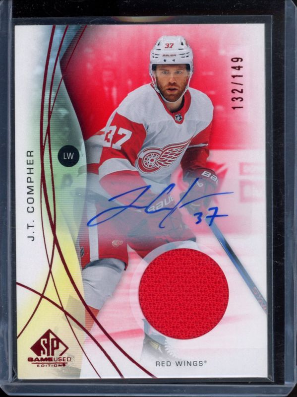 The JT Compher 2024 SP Game Used #86 Base Autographs - Red Jersey /99 card is 1 of 18 JT Compher's card variations in the 2024 SP Game Used set being tracked by Sports Card Investor, including Base, Red, Gold /149, Rainbow Foil /78, and Purple /5.