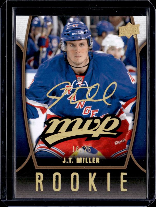 The JT Miller 2013 Upper Deck #53 2013 Upper Deck MVP Super Script /25 Rookie card is 1 of 14 JT Miller's card variations in the 2013 Upper Deck set being tracked by Sports Card Investor, including Young Guns Base, Young Guns Canvas, Young Guns - Acetate, Young Guns - Jumbo, and Young Guns - UD Exclusives /100.