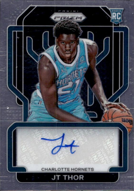 The JT Thor 2021 Prizm #RS-JTT Rookie Signatures card is 1 of 70 JT Thor's card variations in the 2021 Prizm set being tracked by Sports Card Investor, including Base, Blue NBA 75th Anniversary, Blue Wave, Choice Blue Yellow Green, and Factory Set Blue Hyper.