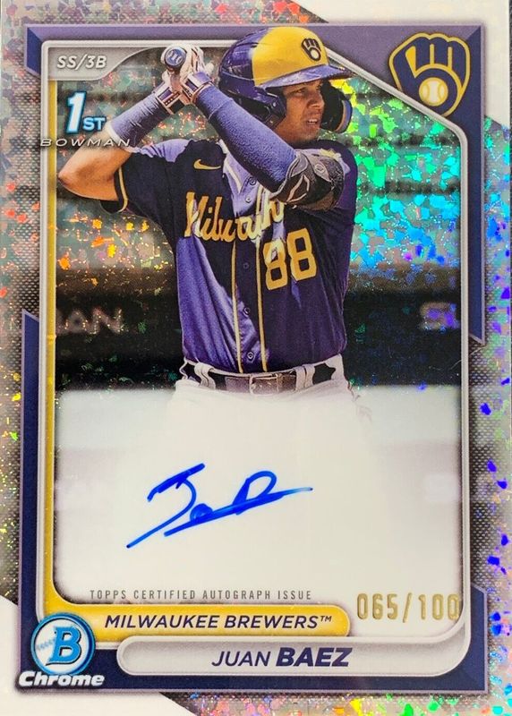 This card is 1 of 51 Juan Baez's card variations in the 2024 Bowman Chrome set being tracked by Sports Card Investor, including Prospects (1st), Prospects - Shimmer Refractor (1st), Prospects - Refractor /499 (1st), Prospects - Speckle Refractor /299 (1st), and Prospects - Purple Refractor /250 (1st).