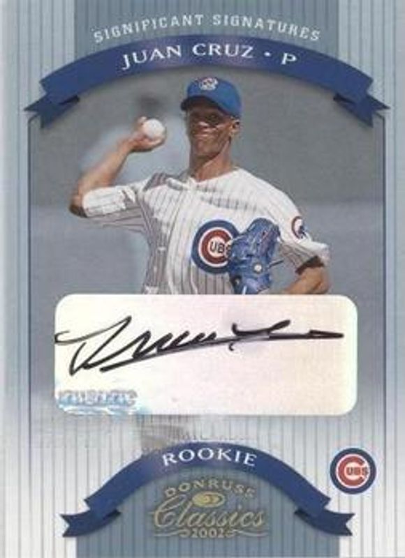 The Juan Cruz 2002 Donruss Classics #101 Significant Signatures /100 card is 1 of 4 Juan Cruz's card variations in the 2002 Donruss Classics set being tracked by Sports Card Investor, including Base /1500, Timeless Tributes /100, and Chicago National /5.
