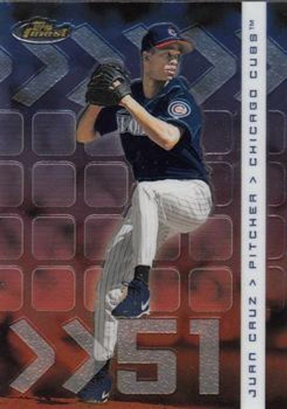 The Juan Cruz 2002 Topps Finest #97 Base card is 1 of 3 Juan Cruz's card variations in the 2002 Topps Finest set being tracked by Sports Card Investor, including Refractor /499, and X-Fractor /299.