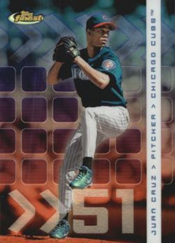 The Juan Cruz 2002 Topps Finest #97 Refractor /499 card is 1 of 3 Juan Cruz's card variations in the 2002 Topps Finest set being tracked by Sports Card Investor, including Base, and X-Fractor /299.