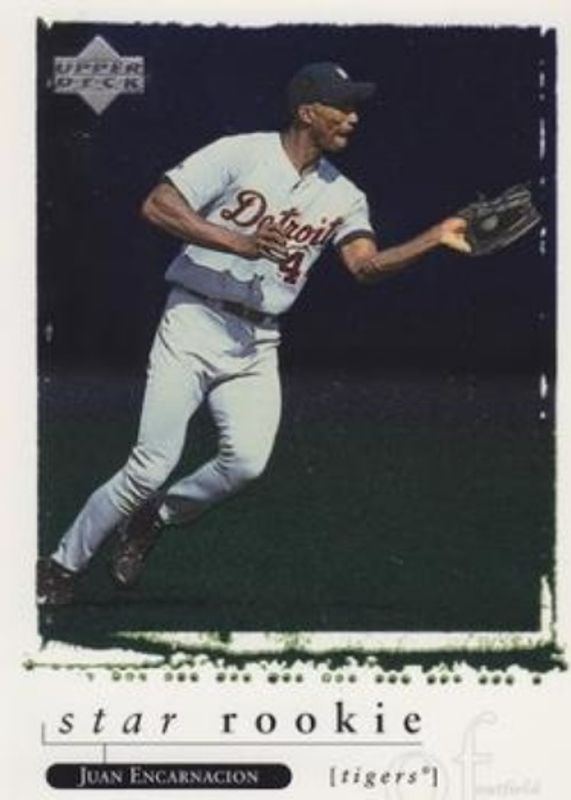 The Juan Encarnacion 1998 Upper Deck #286 Base card is 1 of 4 Juan Encarnacion's card variations in the 1998 Upper Deck set being tracked by Sports Card Investor, including Blue Chip Prospects, Destination Stardom, and Rookie Edition Preview.